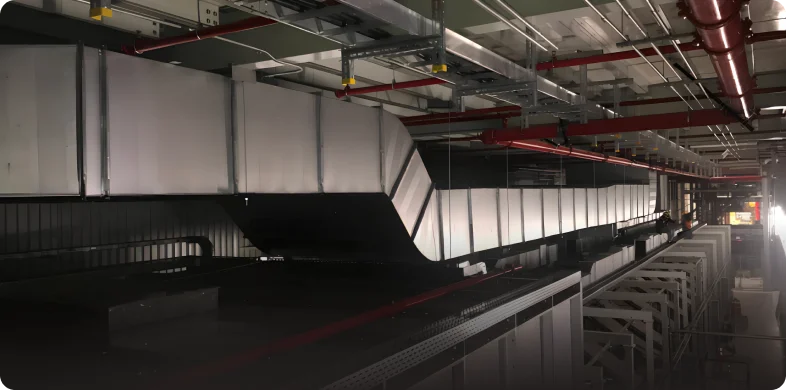 Fabricación e instalación especializada de ductería para sistemas de aire acondicionado industrial, utilizando maquinaria especializada para cumplir con distintos acabados y especificaciones técnicas.